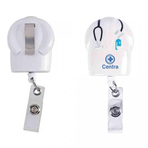 Portagafete de plástico, de cuerpo hueco, forma de bata de doctor, con hilo elastico, clip posterior para sujetar a la ropa y broche para gafete